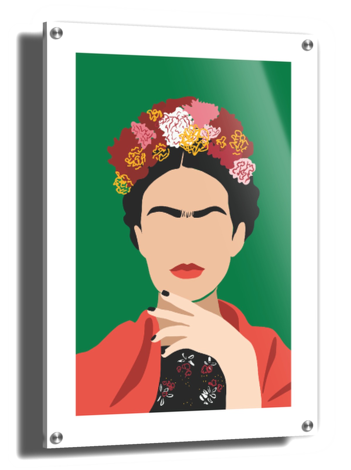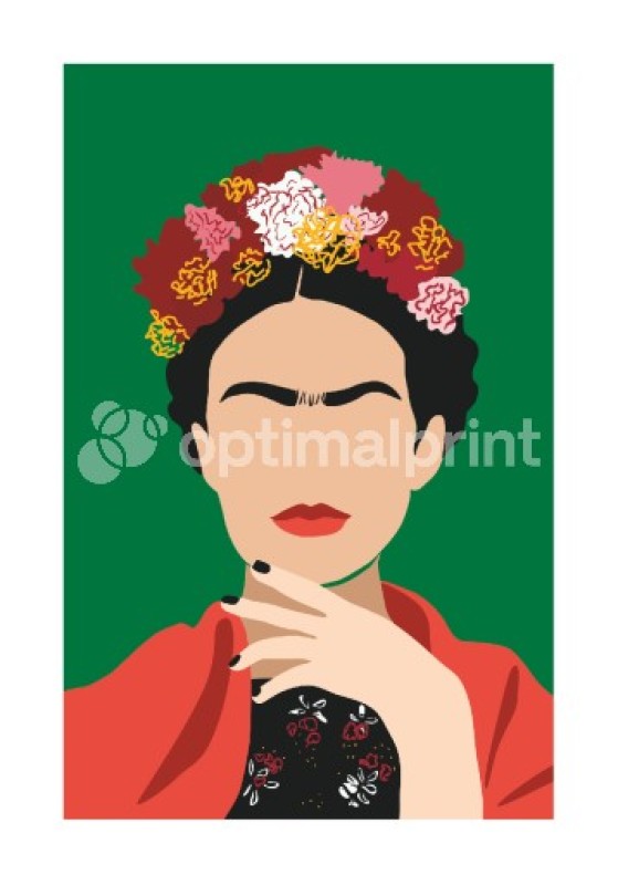 Aprecie esta gravura da famosa artista Frida Kahlo com flores nos cabelos sobre um fundo verde toda vez que você entrar em casa. Ilustração gráfica da famosa artista Frida Kahlo. É possível combiná-la com diversas outras gravuras das nossas coleções. Este poster é impresso com uma borda branca que realça o desenho.